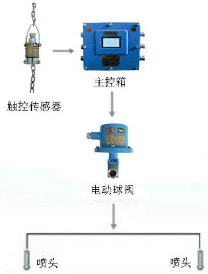 當(dāng)皮帶運(yùn)輸機(jī)輸煤時(shí),煤流觸動(dòng)傳感器探桿,觸控傳感器接收到信號觸發(fā)主控箱控制電路,打開電動(dòng)球閥,裝置自動(dòng)灑水降塵,無物料時(shí)延時(shí)一段時(shí)間后停止噴霧(延時(shí)可調(diào))。