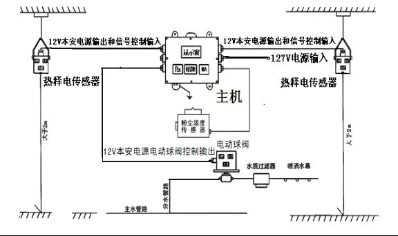 人通過灑水區(qū)域后,熱釋光控傳感器無信號輸出,延時所設定的時間后,電動球閥開啟繼續(xù)噴霧??膳c煤礦監(jiān)控系統(tǒng)聯機,實現粉塵濃度狀況井上傳輸。